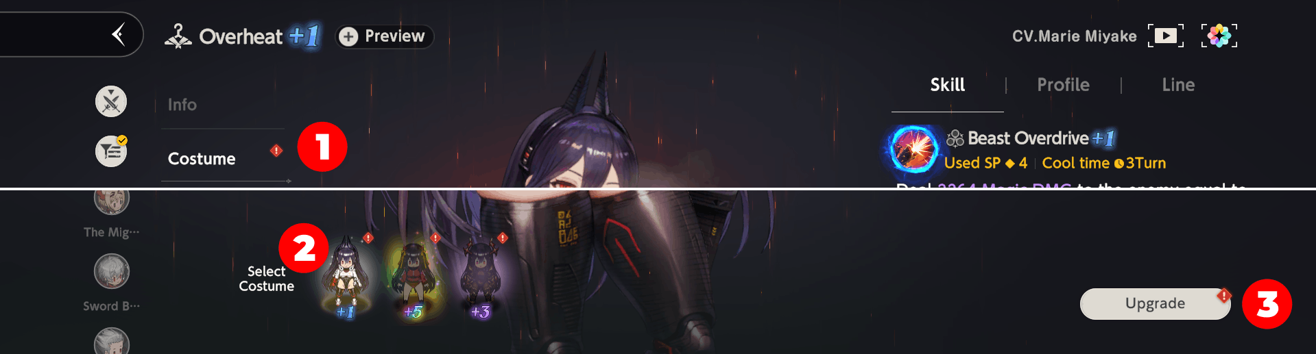 To access this menu, select desired costume in Costume tab and press Upgrade in the bottom right.