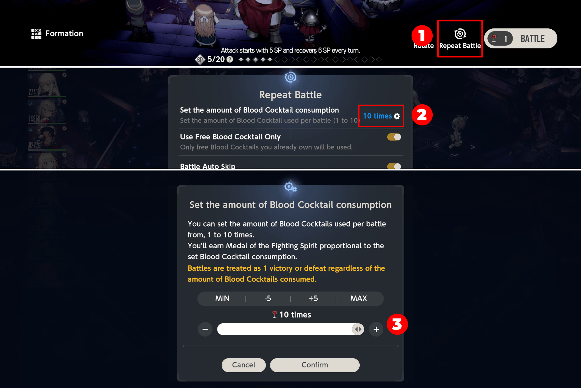 40 battles a day is time-consuming! Use the Repeat Battle menu to set Cocktail consumption to 40 times.