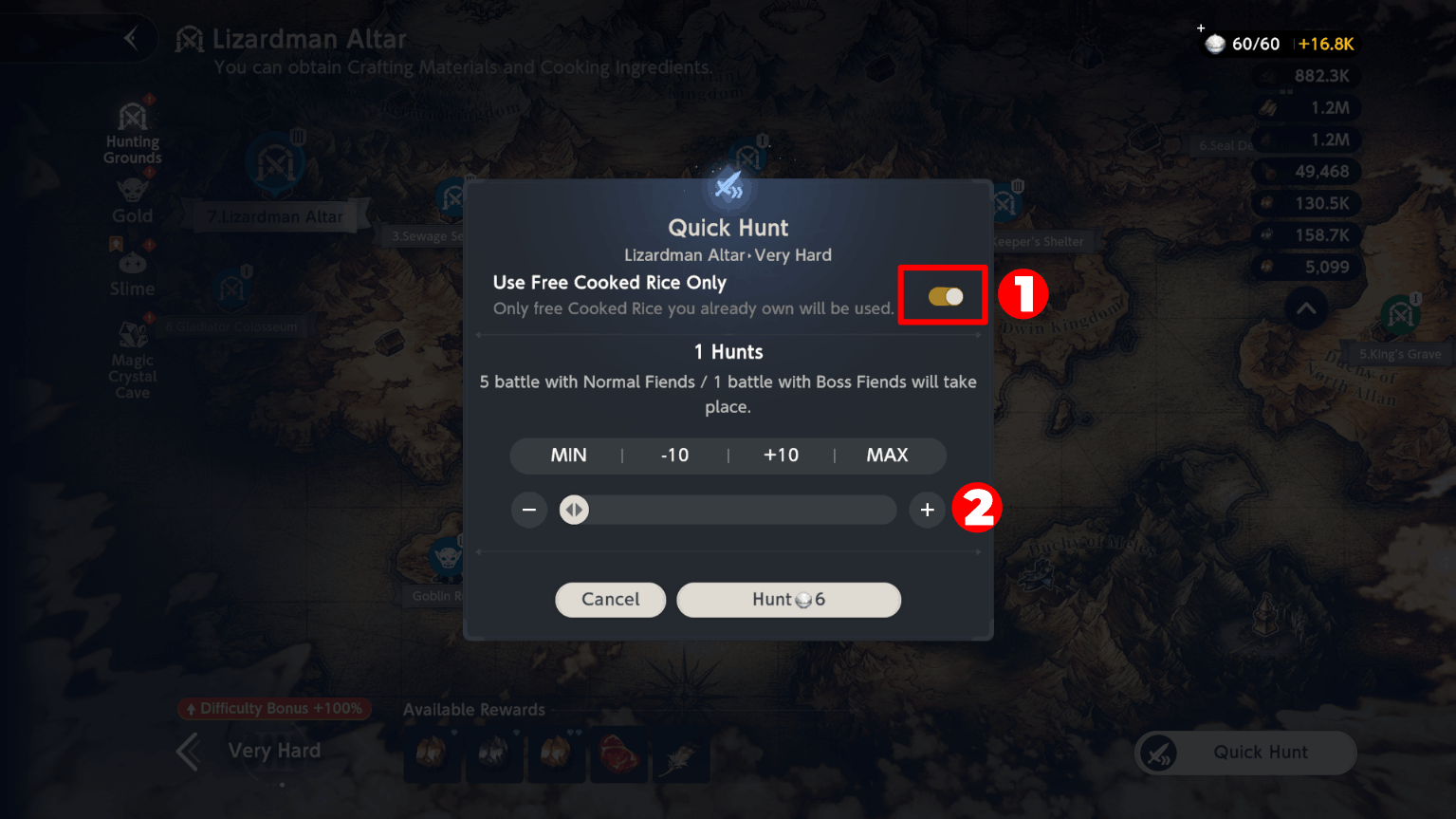 Rice, use 6 rice (equivalent to 1 quick hunt) on Hunting Grounds for the pass task, rest 54 — on